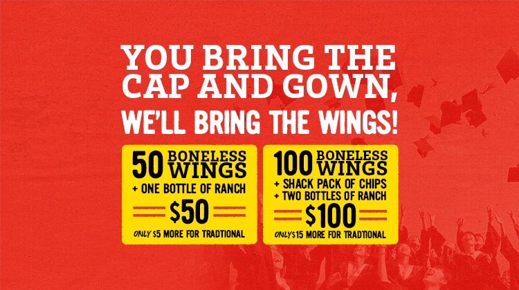 100 Wings. Shack Pack Chips. 2 Bottles of Dressing. You bring the gown. We'll bring the party.