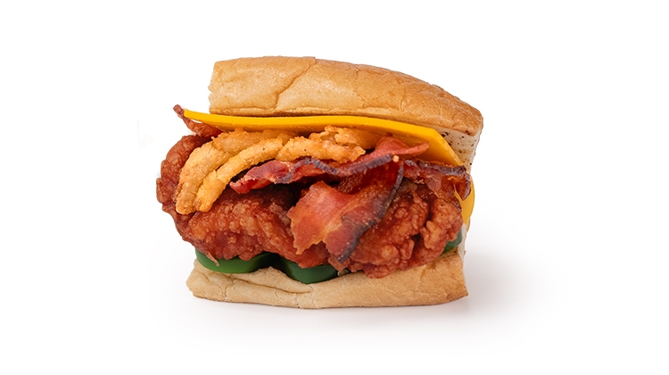 Bacon, crispy onions, cheese, jalapeño, and a BBQ chicken tender.