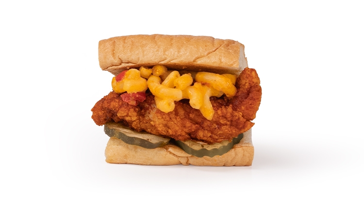 our all new Mac N Cheese on a spicy Nashville Hot tender.