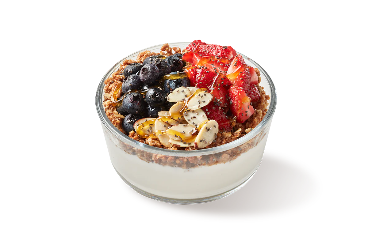 Chobani® Greek Yogurt topped with fresh strawberries, fresh blueberries, granola, almonds, chia seeds & honey drizzle